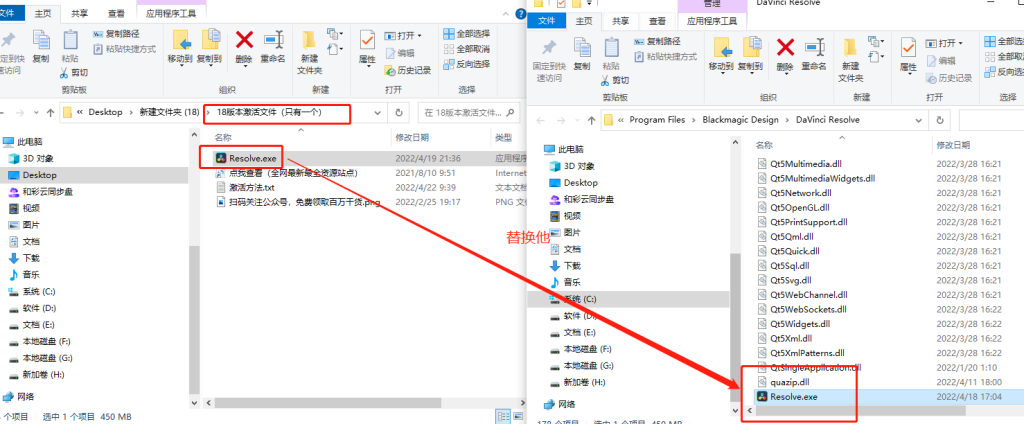 然后把另一个下载文件的激活补丁Resolve.exe拉到刚刚打开的文件位置里面,把原生的Resolve.exe替换掉。